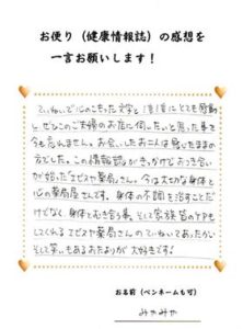 季節の変わり目に発行されるお便りには、困り感を解消する「タイムリーな情報」が満載で、自分に必要な情報を手軽に得ることができます。西洋医学による「薬漬け」に疑問を感じ、ご相談した際、東洋医学の豊富な知識から適切なアドバイスを頂きました。「節分で五季」についての身体の変化、人間も動物であることを再認識した次第です。お便りを見て得た情報を店頭で説明して頂き、理解を深め、生活習慣の改善に努めています。